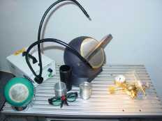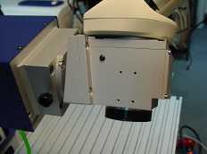 | Schwenkkopf | Schwenkkopf in 3D Ansicht | Bild v.l.n.r.: kleine Magnetspannkugel, Kaltlichtquelle, große Magnetspannkugel, Optikverlängerungen, Schutzbrille, Präzisionsdruckminderer. | Teleskop Z-Achse |